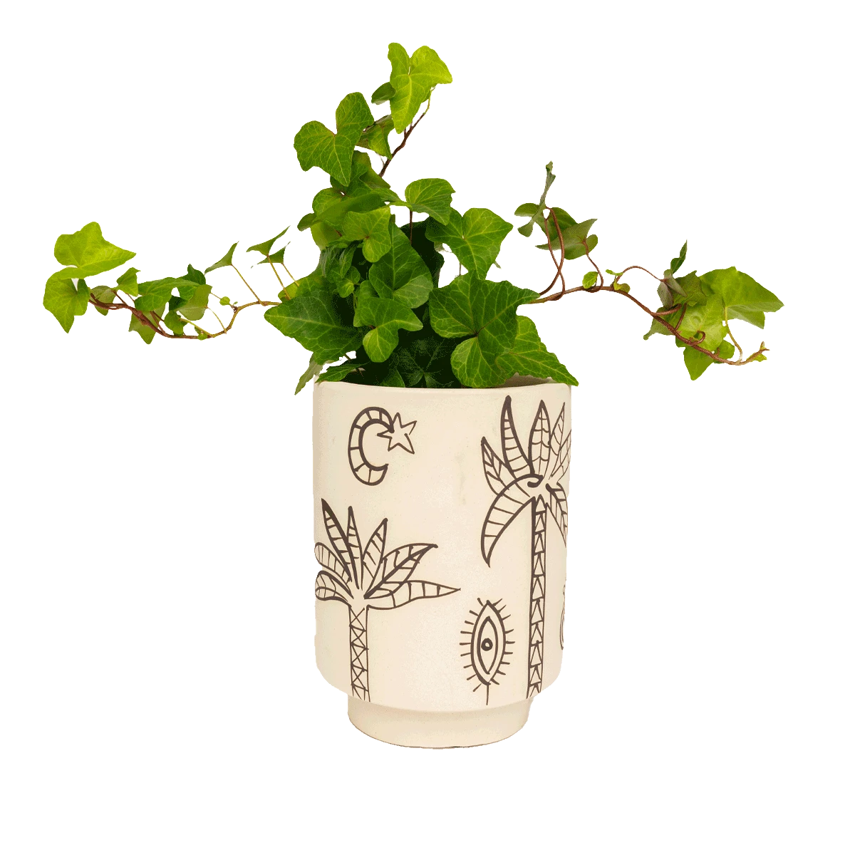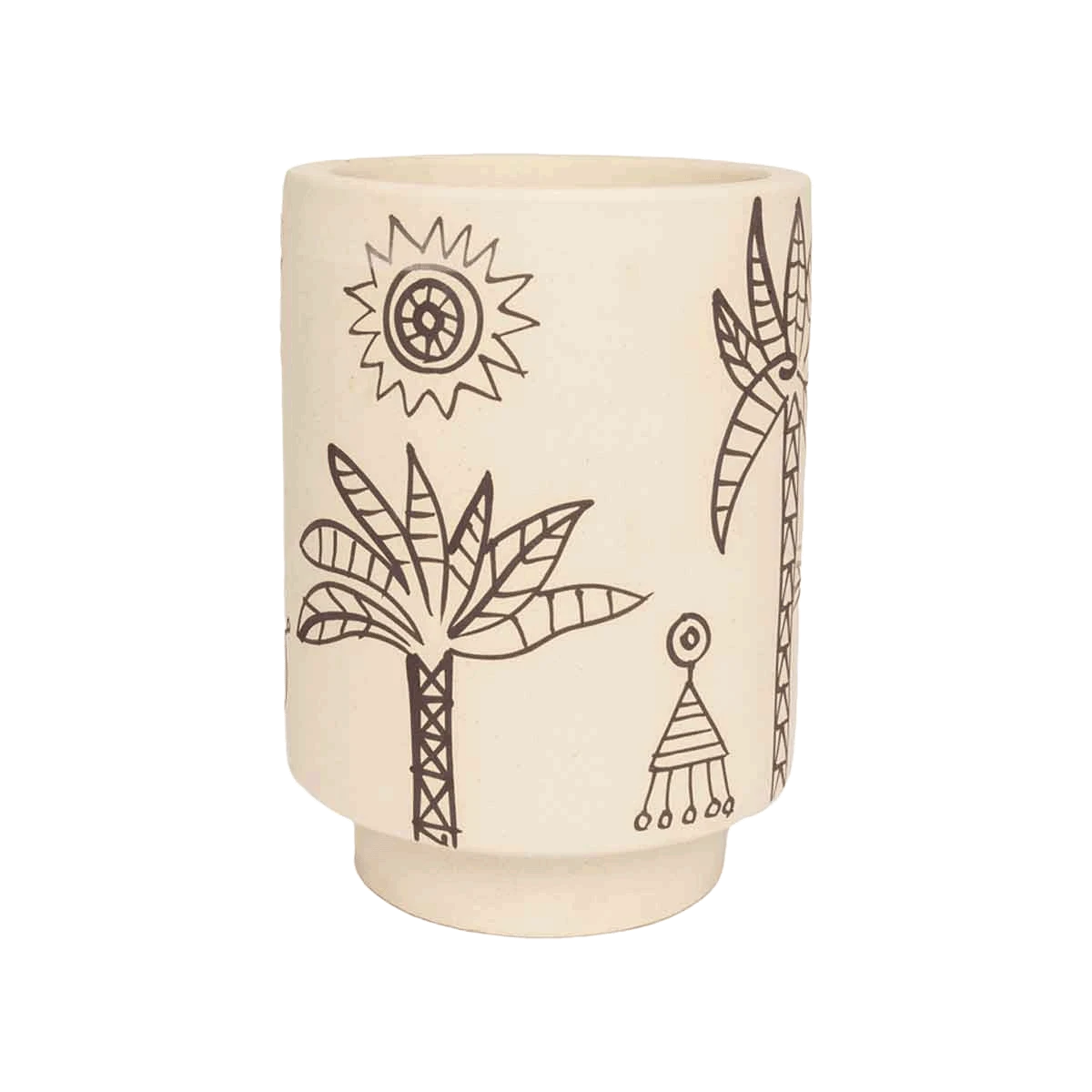 The soothing matte vanilla ceramic allows the contrasting moon, sun, palm tree, eye (and more) illustrations to POP! The artwork is drawn by hand, so each pot is unique – we dig the imperfections and charm that come along with hand-drawn art. The ink color can vary from pot to pot, reading as a warm brown to a charcoal gray depending on the pot & the lighting.